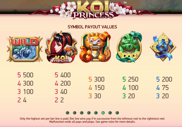 Чтобы составить выигрышную комбинацию у 3d игрового автомата Koi Princess символы должны сложить цепочку, начиная с первого, левого барабана. Особо ценными символами являются: