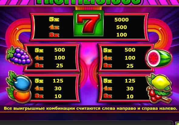 Заметным недостатком слотов старой школы является отсутствие специальных символов. Прежде всего речь идет о диких символах и скаттерах. В случае с Fruitilicious вы такое не увидите и сможете выигрывать только благодаря стандартным комбинациям. Причем лучше всего перед началом игры изучить коэффициенты по изображениям. В отдельном меню присутствует подробная информация по этому поводу.
