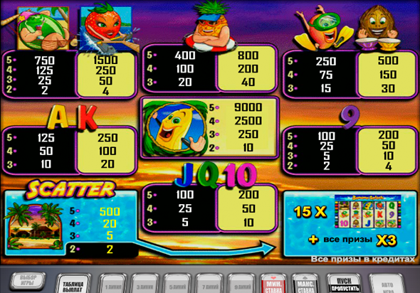 Остров - скаттер в Banana Splash Скаттер в игровом автомате Банановый Взрыв это изображение райского островка, на котором поселились наши фрукты, комбинации с ним засчитываются в любых позициях на экране, не завися ни от активных линий, ни от барабанов. А три и более таких изображения запустят бонусные вращения барабанов в количестве 15-ти, в которых все выигранные кредиты утроятся.