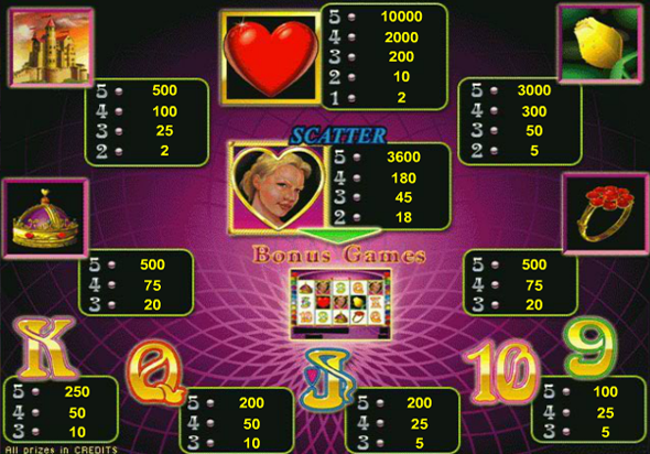 Всего в игровом автомате Queen of Hearts 10 символов, два уже указано, третий по стоимости это знак желтой розы. Намного меньше по значимости, изображения ее собственного замка, корона и кольцо. Буквы и цифры тоже идут почти по одной стоимости и ниже остальных. Удачной игры!