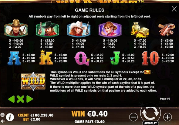 Основные символы игры включают ковбоев, шерифов, золотоискателей и другие атрибуты Дикого Запада, такие как револьверы и мешки с золотом. Каждое вращение барабанов приносит радость и шанс на крупный выигрыш благодаря множеству выигрышных комбинаций и бонусных функций.